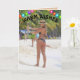 CARTE DE NOËL TROPICALE AVEC UNE BELLE FILLE AUX FORMES GÉNÉREUSES SUR LA PLAGE. "VOEUX CHAUDE"