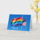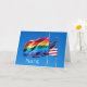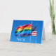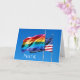 Une carte lumineuse avec un drapeau de la rainbow Pride clignotant et un drapeau américain, dressé contre un ciel bleu brillant. Célébration d'une Amérique accueillante et diversifiée. Photographié à Cherry Grove sur Fire Island. Partie de la collection Pride.