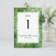 Un design de mariage tendance pour une réception de mariage, une carte de numéro de table élégante avec une luxuriante verdure tropicale, encadrant une zone de modèle personnalisée avec vos noms en écriture moderne, la date et un grand numéro de table.