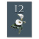 Élégante carte de numéro de table de réception de mariage de style plat réalisée dans une couleur bleu pierre avec une illustration vintage de lys calla blancs. Personnalisez le numéro pour chaque table à votre réception. Des produits de mariage assortis sont disponibles.