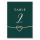 Ajoutez une touche d'élégance à vos tables de réception avec cette carte de numéro de table de mariage en vert émeraude et or. Le détail de cœur de corde romantique et la police serif classique complètent les styles de mariage modernes et intemporels. Se marie parfaitement avec l'ensemble de la suite de mariage Emerald pour un look cohérent.