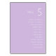 Ce numéro de table est conçu pour être moderne et élégant, avec une simplicité pratique. Son design minimaliste comprend un espace pour écrire chacun des noms de vos invités d'une manière claire et facile à lire. Sa belle couleur mauve douce conviendra à n'importe quel mariage aux tons lavande ou pastel. À titre d'exemple pour le verso de la carte de numéro de table, vous pouvez choisir de conserver le libellé exact comme devant, ou de supprimer le verso et décider d'inclure une photo de vous-mêmes ou de vos noms et date mariage.