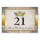 Carte de numéro de table du Mariage Fairytale Ornate. Doté de couleurs pourcentages royales d'or et d'argent et de perles. Cette carte de numéro de table de conte de fées classe et sophistiquée est idéale pour tous les salutations pour montrer vos remerciements. En apportant une touche d'élégance et de charme, vous pourrez mettre en valeur vos tables et faire savoir aux clients où elles sont installées. A des perles et des diamants sur les fleuris qui sont dans les coins. Une couronne royale se trouve en bas à droite, ornée d'or et de bijoux. Une illustration en filigrane se trouve au-dessus d'un arrière - plan vintage et une bordure ornée tient le milieu texturé en papier orné.