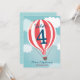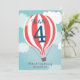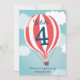 Personnalisez cette jolie carte de numéro de table élégante, conçue avec une illustration originale d'une montgolfière rayée rouge et blanc volant haut dans le ciel bleu avec des nuages blancs.
