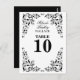 © 2011 Socialite Designs. Une élégante carte de numéro de table en noir et blanc avec de magnifiques tourbillons décoratifs en angle prêts à être personnalisés pour votre événement. Le style de police peut être modifié. Vous avez besoin d'aide pour personnaliser ? N'hésitez pas à me contacter avec vos exigences et un lien vers ce design.