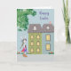 Carte de Pâques avec lapin bohème marchant sur une scène de rue avec des bâtiments colorés, des fleurs et des arbres. Une carte qui fera sourire quelqu'un. Merci à la hungryjpeg et coupes design pour certains des éléments dans le design.
