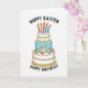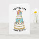 Cette carte représente un gâteau à trois étages centré sur un fond blanc brillant, dessiné avec des ombrages doux et des contours nets. L'étage supérieur est blanc et comporte cinq bougies minces et allumées de teintes pastel douces rose, jaune, verte et bleue. L'étage intermédiaire est bleu clair et présente trois personnages ressemblant à des lapins 🐰, avec un personnage plus grand à longues oreilles souriant chaleureusement tandis que deux compagnons plus petits se penchent en avant comme s'ils partageaient un secret amical. Un cercle de petits cercles dorés et de carottes orange vif les entoure, ajoutant une touche de jardin printanier 🌷. L'étage inférieur est blanc et décoré d'une chaîne continue d'étoiles dorées brillantes ainsi que de quelques explosions d'étoiles éparpillées pour plus d'éclat. Au-dessus du gâteau, les mots « HAPPY EASTER » apparaissent en lettres foncées et épa