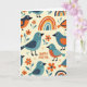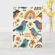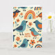 Cette carte présente un motif de style folklorique avec des oiseaux stylisés de couleur sarcelle, bleu foncé et orange rouille chaud, dispersés sur un fond crémeux doux 🐇. Leurs poitrines tachetées, leurs doux yeux et leurs détails de cils fins leur donnent un air doux et amical, comme s'ils se tenaient compagnie en silence. Entre eux se trouvent des fleurs orange vif à cinq pétales avec des feuilles bleu-vert atténuées, ajoutant de petites étincelles de chaleur printanière 🌷. Des formes d'arc courbes apparaissent çà et là comme de petits arcs-en-ciel, créant un rythme tendre et édifiant à travers la scène. Des grappes de petits points dispersés autour des oiseaux ajoutent une texture semblable à des confettis sans surcharger la mise en page. Les mots « JOYEUX PÂQUES » sont placés bien en évidence près du centre en lettres orange arrondies, se détachant clairement sur le fond pâle. Les oiseaux et les fleurs sont espacés de manière régulière, de sorte