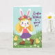 Cette carte montre une scène printanière avec une figure debout ressemblant à un lapin, dessinée avec de longs cheveux ondulés dorés, des oreilles blanches douces, des joues roses, des yeux brillants et un petit nez en forme de cœur 🐰. Une couronne de fleurs rouges, roses, jaunes et violettes repose sur sa tête, et son doux sourire et sa posture détendue suggèrent une humeur amicale et affectueuse. Elle se tient debout légèrement à gauche du centre, vêtue d'un haut rose corail, d'une jupe lavande fluide et de bottes marron, comme si elle s'arrêtait pour partager un moment de tranquillité à l'extérieur. Sur le côté droit, un court message apparaît en lettres cursives violettes, posé sur le ciel ouvert pour une lecture facile. Des collines vertes ondoyantes s'étendent le long du bas, parsemées de petites fleurs blanches semblables à des étoiles qui semblent dispersées par une légère brise 🌷. Deux poussins jaunes duveteux avec de petits becs orange restent proches -