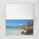 Carte pliée avec une photo d'une plage bleu turquoise de l'océan avec de gros rochers éparpillés le long de la côte. Région tropicale claire et ensoleillée.