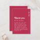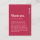 Express votre gratitude dans le style avec la carte Chic Retro Bright Hot Pink Mariage Merci Place Card. Dotée d'un design rose vif et d'une typographie d'inspiration rétro, cette carte est à la fois un remerciement attentionné et un cadre élégant pour vos invités. Parfait pour ajouter une pop de couleur à vos tables de réception tout en créant une touche personnalisée. Entièrement personnalisable pour correspondre à votre thème mariage !
