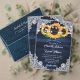 Carte de mariage personnalisée bleu marine et tournesol. Un design de carte idéal pour compléter votre campagne, jardin, jardin ou fête de mariage marine bleu marine inspirée des tournesols. Objets correspondants disponibles pour aller avec ces cartes de mariage bleu marine floral.