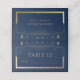 Mystical Chic Blue Gold Sun Moon Stars Astronomie Celestial Cosmic Space Mariage Place Cards Escort Cards dispose d'un soleil doré, de lune et d'un cadre étoiles sur un arrière - plan bleu marine foncé. Ajoutez le numéro de table sur le devant avec le nom du marié et de la date du marié et du mariage sur le verso dans la typographie de script or moderne. Conçu pour vous par Evco Studio. Afficher www.zazzle.com/store/evcostudio pour plus de produits dans cette collection