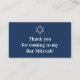 Ces cartes marines bleu marine, gris et blanc Bar Mitzvah placards seraient très alléchantes à votre soirée Bar Mitzvah. Ces cartes à plat Bar Mitzvah ont un motif rayé bleu marine et gris argenté simulé derrière une zone de texte en forme de billet gris et blanc. Le dos est marine avec un libellé blanc qui dit, "Merci d'être venu à mon Bar Mitzvah!" dessus et il y a une étoile de David en gris au-dessus du libellé que vous pouvez supprimer.