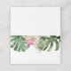 Carte de lieu à thème tropical moderne avec illustration aquarelle de feuilles de monstera, feuille de palmier et fleur de protea roi rose. Parfait pour votre mariage d'été, douche de mariée, douche de bébé ou fêtes d'anniversaire.