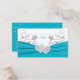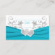 Cette romantique carte blanche turquoise ou turquoise couleur bleue florale mariage a l'image d'une paire de coeurs unis au-dessus d'une image ruban turquoise courant sur la largeur de la carte place avant. Le texte bleu turquoise sur un arrière - plan blanc est entouré de fleurs d'argent et de vignes au-dessus du ruban. Les noms de la mariée et du marié, ainsi que la date du mariage, sont imprimés sur le dos de la carte en blanc avec des fleurs en argent sur un arrière - plan bleu turquoise entourant le texte.