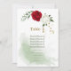 carte de numéro de table avec fleurs rouges et blanches, quelques feuilles vertes et paillettes dorées