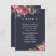 Élégantes cartes de plan de mariage floral en bleu foncé avec place pour jusqu'à dix invités en texte blanc, avec de beaux bouquets de fleurs comprenant des roses roses et des hortensias bourgogne.