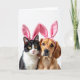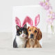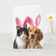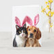 Cette carte montre un portrait en gros plan de deux compagnons de maison confortables - un chat noir et blanc et un chien brun doré - posés côte à côte sur un fond blanc brillant. Ils portent des serre-têtes à oreilles de lapin roses pelucheux 🐰, et les plis du tissu souple se posent haut sur leur tête comme un costume partagé pour deux amis proches. Les yeux jaunes du chat rencontrent les vôtres avec un regard calme et légèrement timide, posés au-dessus d'un petit nez rose et de longues moustaches blanches. Les yeux sombres du chien penchent vers le chat avec un regard tendre et protecteur, son pelage chaud captant la lumière douce. L'éclairage reste uniforme et doux, faisant ressortir la texture fine de la fourrure et le brillant lisse des oreilles roses sans ombres dures. Près du haut, une courte salutation de Pâques apparaît en lettrage rose clair, centrée au-dessus de leurs