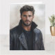 Cette carte d'art design présente un portrait cool aquarelle d'un jeune homme chic en train de rocailler un t-shirt noir et une veste en cuir noir avec un col retourné. Sa barbe rasée et son look moderne exsument la confiance. Le style aquarelle apporte une touche artistique unique. Parfait pour envoyer un accueil contemporain, une note design, ou pour quiconque apprécie le portrait masculin moderne.