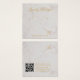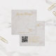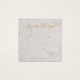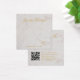 Une carte de présentation de boucles d'oreilles en marbre et or simple mais élégante : simplement du texte doré sur fond de marbre blanc. Le nom est écrit dans une calligraphie élégante en dessous, les emplacements des boucles d'oreilles indiqués par deux très petits cercles. Le site web est écrit près de la bordure inférieure.
