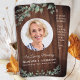 Cartes de prière funéraire en bois rustique Eucalyptus. Cette carte de prière funéraire élégante et rustique présente une verdure d'eucalyptus sur un design en bois rustique. Avant "En souvenir affectueux" Personnalisez cette carte de prière funéraire avec la photo, le nom et les dates de votre proche, ainsi que vos sentiments. Arrière ~ Poème "Miss Me", qui peut être personnalisé, veuillez nous contacter si vous souhaitez un design avec un poème spécifique autre que celui-ci. Cette carte de prière funéraire sera un souvenir précieux, pour les services funéraires et la célébration de la vie. COPYRIGHT © 2020 Judy Burrows, Black Dog Art - Tous droits réservés. Carte de prière funéraire mémorial en bois rustique avec verdure.