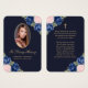 Belle carte de mémoire florale bleu et or/carte de prière funéraire avec une photo ornée de roses roses et bleus et de fleurs d'haleine de bébé sur un arrière - plan bleu foncé.
