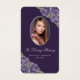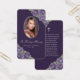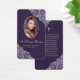 Elégante carte de mémoire florale violet et argent/carte de prière funéraire avec une photo ornée de roses violets et de fleurs d'haleine de bébé sur un arrière - plan violet foncé.