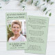 Simple carte de prière verte sage pour le service funéraire et commémoratif d'un être cher avec "In Loving Memory Of" et "Eternellement dans nos coeurs" dans un mélange de typographie et un script élégant. Personnalisez avec leur photo, nom et date de naissance et de décès. L'envers comporte un long passage inspirant ("Ne remplissez pas vos coeurs de douleur") et un message plus court, ou customisez avec vos propres messages ou versets bibliques.