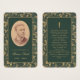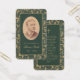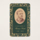 Une carte de prière commémorative avec une atmosphère vintage pour un enterrement. Des deux côtés, elle présente un élégant cadre doré vintage avec des volutes de feuilles en spirale sur fond vert foncé. Sur le devant, il y a une photo ovale vintage avec un bord doré et un texte doré en dessous. Le nom est écrit dans une élégante écriture calligraphique. Au dos, il y a une prière, en majuscules dorées, avec une croix dorée au-dessus.