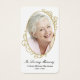 Un hommage élégant et réfléchi à un être cher. Un cadre ovale féminin et orné d'or encadre la photo de la personne décédée. Trois lignes de texte ci-dessous vous permettent de le personnaliser. J'ai choisi dans Loving Memory, leur nom et leurs dates de vie. Une belle croix dorée brillante se trouve sur le dessus du dos. Ci-dessous, il y a de l'espace pour une prière, un psaume ou un poème. L'arrière - plan est blanc.