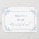 Créez une proposition de fête de mariée mémorable pour votre Maid of Honor qui est aussi intemporelle que votre amour avec ces cartes de proposition de Mariage minimal chic bleu et blanc qui exsument la combinaison parfaite d'un design élégant simple avec une esthétique de vieux argent côtier. Le design polyvalent est parfait pour le couple qui crée un thème romantique avec une combinaison classique de script et de typographie et un élément graphique vintage légèrement rétro. Conçu par Simple Desert Designs Studio. Faites-nous un message pour des couleurs plus customisées pour correspondre à votre teinte spécifique.
