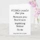 Une façon amusante et amusante de proposer. L'avant dit "Un petit casse-tête pour vous parce que vous n'avez rien de mieux à faire". En dessous il s'exclame "Hé, c'était une rime !" Ce qui a fini par me surprendre. L'intérieur comporte un mot trouver puzzle dans lequel les mots, vous, épousez, moi sont cachés. Une façon mignonne et amusante de proposer.