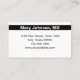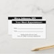 La carte de rendez-vous de ce médecin professionnel est recto verso. La première partie indique "Votre prochaine nomination" et comporte des lignes pour la date et l'heure du rendez-vous. En bas, il y a le texte d'affichage que vous pouvez modifier pour créer un message personnalisé si vous le souhaitez. (Affichage : Veuillez fournir un préavis de 24 heures si vous ne pouvez pas garder votre rendez-vous.) La deuxième partie a un texte d'affichage à remplacer par le nom du médecin (ou le nom de l'exercice) et son adresse, son numéro de téléphone et son site Web. Tout le texte peut être modifié ou supprimé. Le texte est noir. La carte de rappel de rendez-vous est blanche.