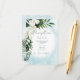 Ce design de carte de réception de mariage présente une belle végétation tropicale luxuriante et des fleurs blanches sur un arrière - plan d'eau bleu aqua des Caraïbes doux. Parfait pour la destination ou le mariage sur la plage. Créé par Simply Farmhouse Press.