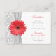 Carte de réception de mariage florale en damas gris argenté et blanc avec gerbera corail. Les couleurs sur cette carte de réponse de mariage corail daisy sont gris argenté (gris), corail (saumon) et blanc.
