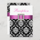 Cartes de réception de mariage élégantes en noir et blanc avec damas, avec une impression photo d'un ruban de satin rose, un bijou carré avec impression photo de diamants blancs. Graphisme damas Elke Clarke© sous licence. Personnalisez avec les détails de votre réception de mariage. Parfait comme carte incluse dans vos invitations de mariage pour informer vos invités de tous les détails de votre réception de mariage.