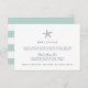 Conçue pour aller avec nos collections de faire-part de mariage nautiques, cette carte d'invitation de réception de mariage chic côtier dans les tons mint et navy présente une petite illustration d'étoile de mer de style vintage en haut avec une écriture élégante en bleu marine et un fond rayé horizontalement en vert écume de mer et blanc. Ajoutez vos détails de réception comme l'heure, le lieu et l'adresse en utilisant les champs fournis.