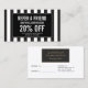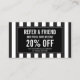 Coordonner avec le modèle de carte d'affaires Black and White Stripes Salon III d'ici 12 h 01. Une carte de référence design pour le salon avec un arrière - plan rayé noir et blanc d'inspiration vintage. Mettez à jour le texte de promotion pour votre offre désirée. Générer plus de ventes et de visites en encourageant vos clients à recommander leurs amis pour un service à rabais ou un produit gratuit. Idéal pour les salons de beauté, les maquilleurs, les boutiques, les coiffeurs, les cosmétologues et bien plus encore. © 1201AM CREATIVE