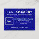Attirer plus de clients. Convainquez plus de clients à acheter vos produits ou à aimer vos services en offrant des rabais. Faites également de la publicité pour votre entreprise, faites la promotion de votre marque ou faites de la sensibilisation à votre marque. Customisez cette carte de réduction en spécifiant la remise en pourcentage que vous offrirez, la date de validité, le téléchargement du logo de votre entreprise, en tapant votre nom d'entreprise ou d'entreprise, votre adresse et votre numéro de téléphone. La couleur de la carte de réduction est bleue et les couleurs de police sont bleu clair et blanc. Veuillez vérifier l'apparence après avoir téléchargé le logo et tapé des textes. Si l'apparence vous plaît, vous pouvez passer votre commande maintenant. Si vous avez besoin de redimensionner et déplacer le logo et les textes pour s'adapter à cette carte de réduction ou à d'autres formes et tailles que vous choisirez, veuillez modifier dans l'outil de conception. Vous pouvez également effectuer d'autres modifications en fonction de vos préférences dans l'outil de conception, comme modifier la couleur de la carte de réduction, la couleur de police, le style de police, modifier des textes, ajouter des textes et supprimer des textes.