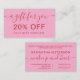 A bold pink and red discount card template designed for makeup artists, hairstylists, estheticians, and salon pros. Featuring stylish modern-retro typography and space for contact details and socials, this design is both eye-catching and practical. Front side offers a clean 20% off message, while the back includes all your business info and a deadline for the offer. Perfect for beauty professionals who want to reward returning clients or include a loyalty touch in thank you bags. Edit easily to match your tone and branding.