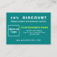 Attirer plus de clients. Convainquez plus de clients à acheter vos produits ou à aimer vos services en offrant des rabais. Faites également de la publicité pour votre entreprise, faites la promotion de votre marque ou faites de la sensibilisation à votre marque. Customisez cette carte de réduction en spécifiant la remise en pourcentage que vous offrirez, la date de validité, le téléchargement du logo de votre entreprise, en tapant votre nom d'entreprise ou d'entreprise, votre adresse et votre numéro de téléphone. La couleur de la carte de réduction est turquoise et les couleurs de police sont jaune vert et blanc. Veuillez vérifier l'apparence après avoir téléchargé le logo et tapé des textes. Si l'apparence vous plaît, vous pouvez passer votre commande maintenant. Si vous avez besoin de redimensionner et déplacer le logo et les textes pour s'adapter à cette carte de réduction ou à d'autres formes et tailles que vous choisirez, veuillez modifier dans l'outil de conception. Vous pouvez également effectuer d'autres modifications en fonction de vos préférences dans l'outil de conception, comme modifier la couleur de la carte de réduction, la couleur de police, le style de police, modifier des textes, ajouter des textes et supprimer des textes.