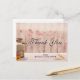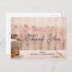 Une carte de remerciement pour un mariage ou autre. Conçue avec un thème rustique campagnard. Un vieux pot à lait rouillé avec une jolie fleur jaune à ses côtés. Du blé et des fleurs roses délavées à l'arrière-plan sur un panneau de bois légèrement visible.