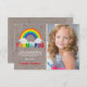 Carte de remerciement de fête d'anniversaire enfantine rustique avec un arc-en-ciel magique, une photo de l'enfant qui fête son anniversaire, des étoiles colorées éparpillées et un message de remerciement qui peut être personnalisé pour tous ceux qui ont aidé à célébrer votre journée spéciale.