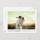 Ce modèle de carte de remerciement de mariage simple et élégant avec photo présente vos noms et date sous votre photo ainsi que 'AMOUR & REMERCIEMENTS'. Vous pouvez choisir de modifier la police, la ponctuation ou la couleur utilisée pour divers éléments de texte de ce design sur le recto et/ou verso. Par exemple, vous pouvez choisir de changer la couleur du texte 'AMOUR & REMERCIEMENTS'. Nous avons choisi une teinte orange très claire et pâle pour le fond au verso,
