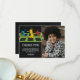 Carte de remerciement d'anniversaire de trampoline avec un fond noir uni, une photo adorable de votre enfant, des terrains de trampoline, des enfants qui sautent et volent dans les airs, et un modèle de remerciement personnalisé moderne facile à personnaliser.