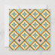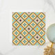Abstract geometric pattern with diamond shapes in pastel colors. Each contains a star-like motif in teal, orange, or brown. Retro and symmetrical design.
