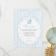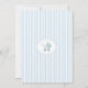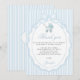 Elegant preppy baby boy shower thank you card showcasing cute blue stroler surrouded by lovely scallop frame decorated with blue bow and striped pattern all around.