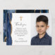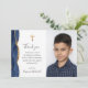 Cette élégante carte de remerciement moderne pour la Première Communion présente une bordure d'agate aquarelle bleue rehaussée de paillettes dorées fausses. Une petite croix en feuille d'or faux apparaît au-dessus des mots "Merci" en écriture manuscrite gris charbon sur fond blanc. Modifiez le texte avec votre message personnel, ajoutez le nom de votre enfant en écriture manuscrite, et remplacez facilement l'image exemple par une photo de votre enfant. Le verso de la carte présente un motif assorti d'agate bleue et dorée.