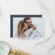 Les cartes de remerciement de mariage élégantes comportent une seule photo horizontale ou orientée paysage avec "Merci" superposé dans le script de calligraphie bleu marine chic, Personnalisez avec vos noms et date mariage le long du bas en lettres de bloc classique. Ajoutez un message personnel et une signature à l'arrière.